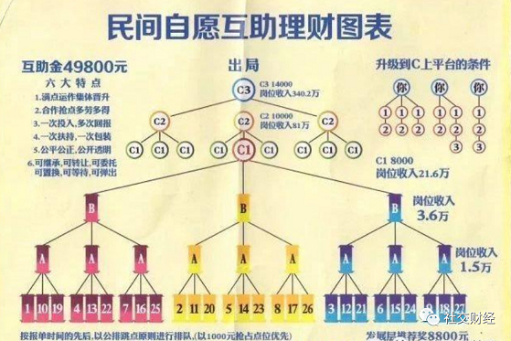 北京相关律师告诉社交财经:“民间自愿互助理财”打着低投入高回报的旗号,以诱惑被害者进入骗局,该骗局是庞氏骗局的一种‘创新’,它打破了传统庞氏骗局的单一大金字塔模式,通过建立若干小金字塔、‘翻盘’”和‘抢点’制度,激励被害者主动参与施骗过程,使被害者成为主动加害者,从而扩大骗局影响范同。”