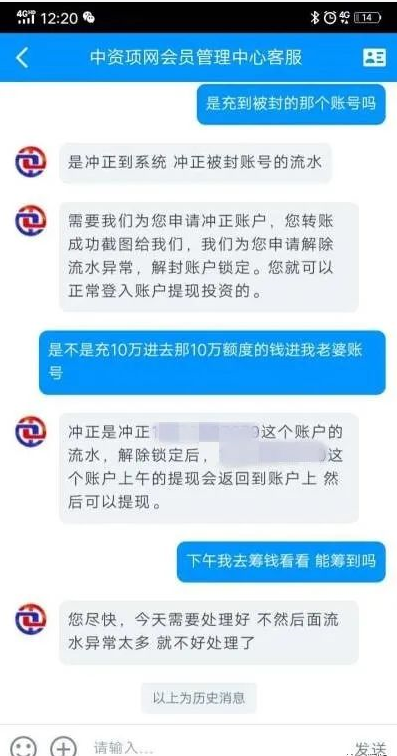 第五步:客服以投资者动了不是自己的钱导致账户被封为由,诱骗投资者充值数万元冲正流水解封,使其“越投越亏”。