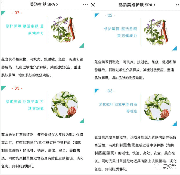 微信公众号“熟龄美姬SPA”和“美涟护肤SPA”宣传文案基本一致。