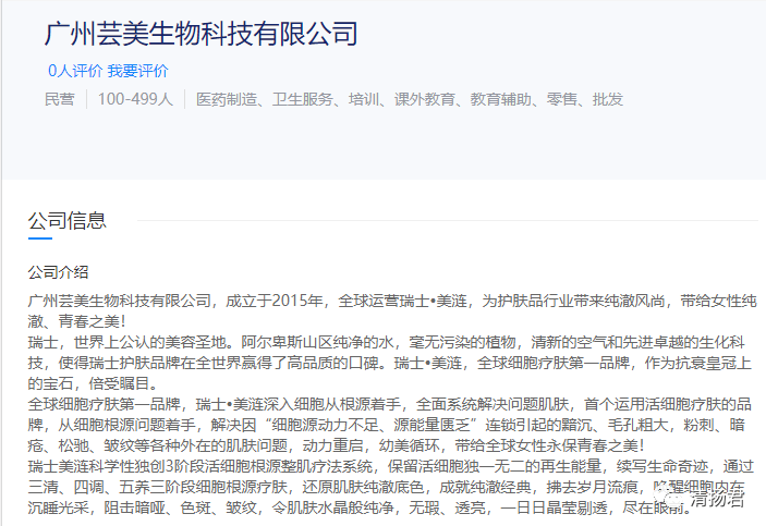 而在智联招聘上,芸美生物自述成立于2015年,全球运营瑞士·美涟,为护肤品行业带来纯澈风尚,带给女性纯澈、青春之美!瑞士·美涟,全球细胞疗肤第一品牌;瑞士·美涟深入细胞从根源着手,全面系统解决问题肌肤,首个运用活细胞疗肤的品牌,从细胞根源问题着手,解决因“细胞源动力不足、源能量匮乏”;瑞士美涟科学性独创3阶段活细胞根源整肌疗法系统,保留活细胞独一无二的再生能量,续写生命奇迹……