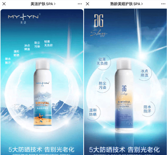 熟龄美姬和美涟这两个品牌的“冰点防护喷雾”,产品都宣传“温和防晒”、“5大防晒技术,告别光老化”等内容。
