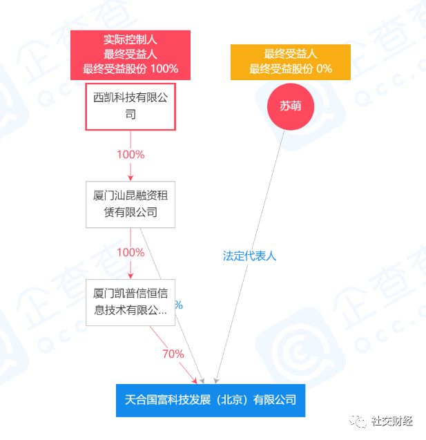 据企查查显示,天合国富公司成立于2016年5月19日,注册资本1亿元,公司法定代表人苏萌兼任经理和执行董事,厦门凯普信恒信息技术有限公司和厦门汕昆公司分别为公司持股70%和30%的机构股东,股权穿透后,天合国富公司最终的100%控制人为一家名为西凯科技有限公司(SKYLINE INNOVATION TECHNOLOGY CO.,LIMITED)的香港注册企业,但该公司无法查询股东投资关系及实际控制人信息。此外,企查查显示,厦门汕昆公司名下拥有一个名为“中经国富”的金融物管类商标,而天合国富公司的官网名称也为“中经国富”,天合国富公司法定代表人苏萌也是“中经国富”总裁。
