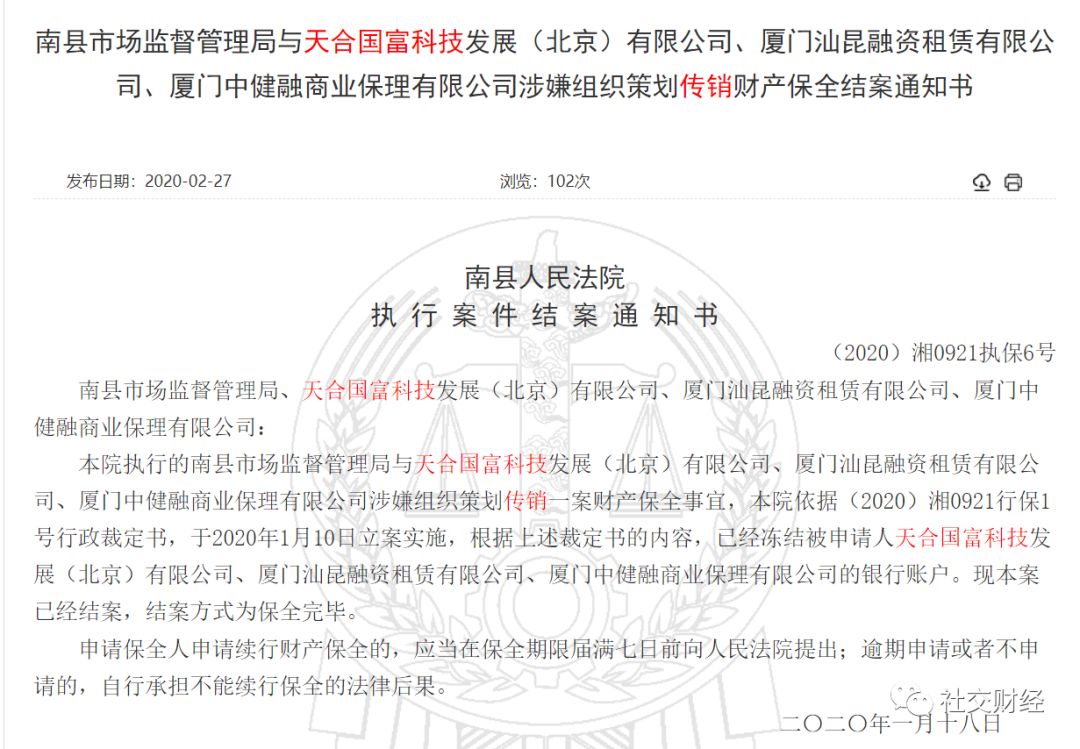 近日,社交财经在中国裁判文书网发现一则《南县市场监督管理局与天合国富科技发展(北京)有限公司、厦门汕昆融资租赁有限公司、厦门中健融商业保理有限公司涉嫌组织策划传销财产保全结案通知书》,该通知书由南县人民法院发布的执行案件结案通知书。