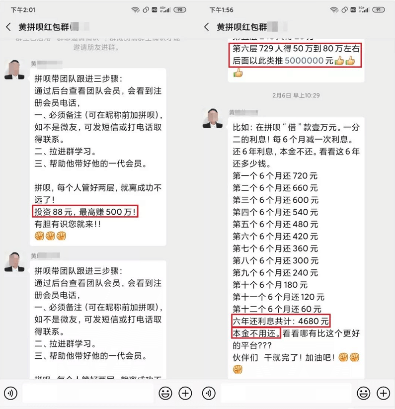 “有困难找拼呗,数百万创业金轻松领,借款不用还,可消费可自由支配,额度源源不断提升。分享给好友,最高还能赚500万元。”近日,鹰鉴被网友拉入一个叫做“黄拼呗红包群”的微信群中,群里面每天不停的在发布上述带有鼓动性的文字。难道,天上真的会掉馅饼吗?鹰鉴通过调查发现,“拼呗”的运营模式已经存在涉嫌传销的行为。