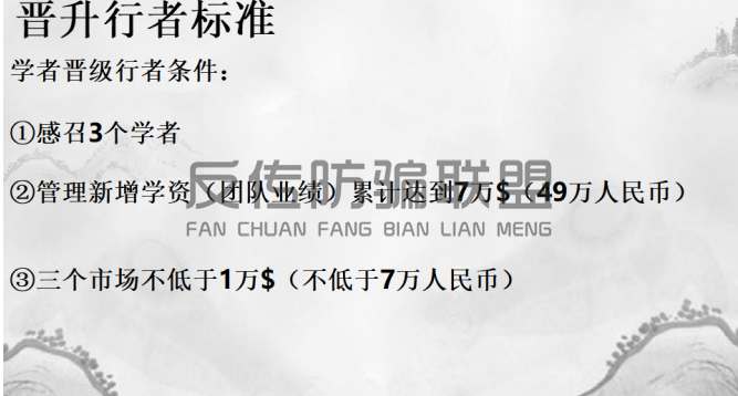 学者发展三名学者且团队业绩达到49万,同时三个市场不低于7万,可晋升为行者。