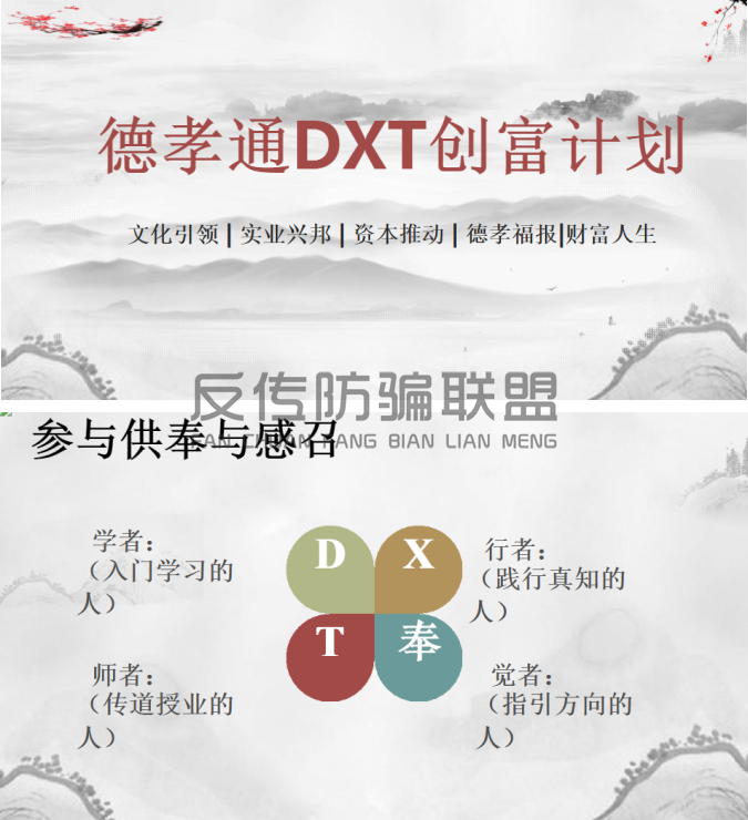如今时隔两年,又有网友举报天机集团的“德孝通TXT创富计划”项目一次性要投资十几万,其拉人头的营销手法涉嫌传销: