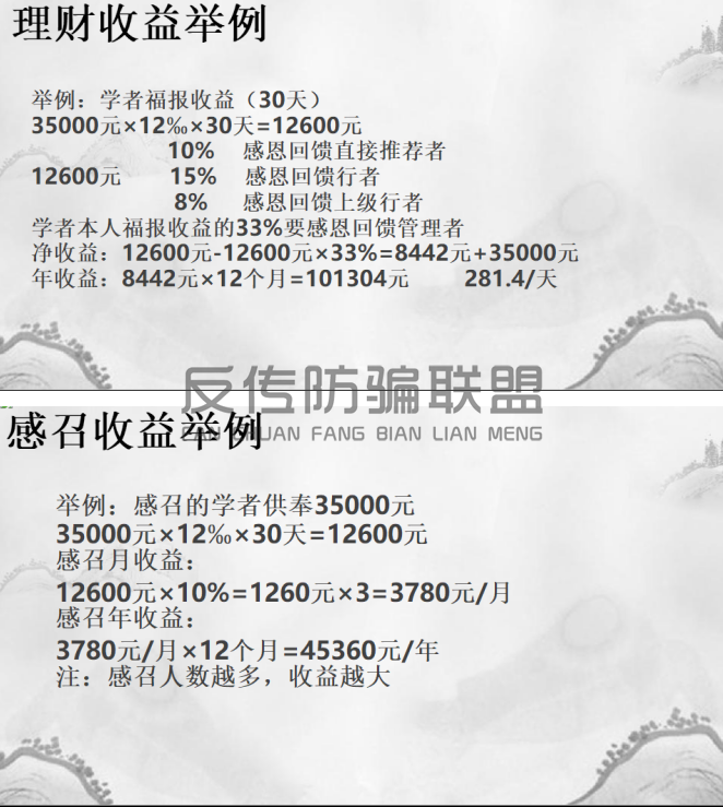 以学者的收益为例,投资35000元,千分之十二的收益,30天后可收益12600元,其中收益的33%需返利给上面的三级:直接推荐者10%、行者15%、上级行者8%,扣除返利部分后,剩下的8442元归投资人。
