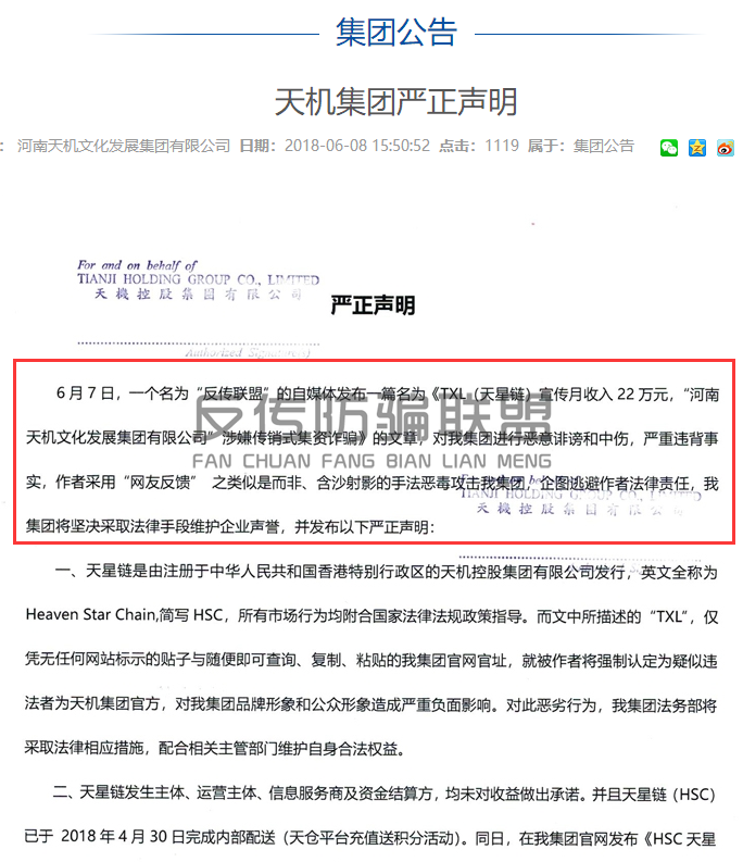该声明中说道“有媒体对天机集团进行恶意诽谤和中伤,采用“网友反馈”之类的似是而非、含沙射影的手法恶意攻击天机集团”