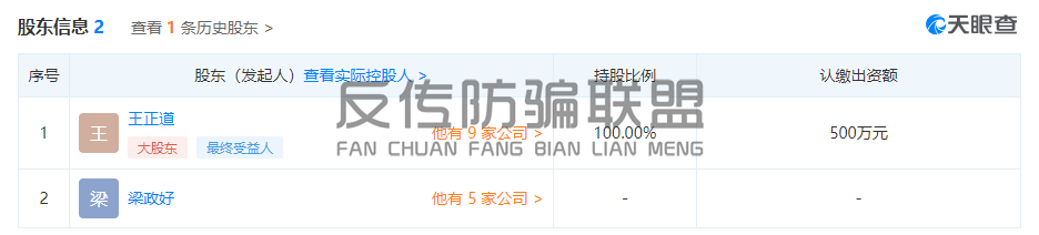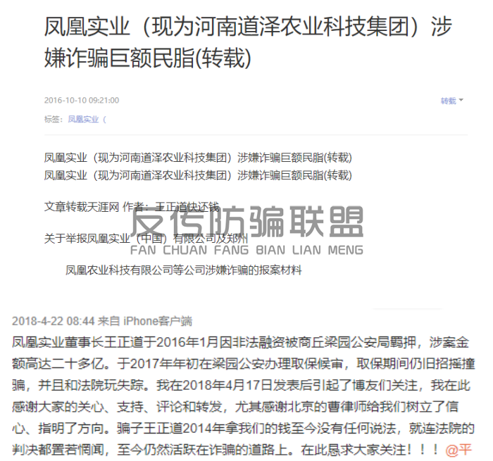 在股东信息中,反传防骗联盟看到王正道持股比例为100%,为凤凰实业的实际控股人。