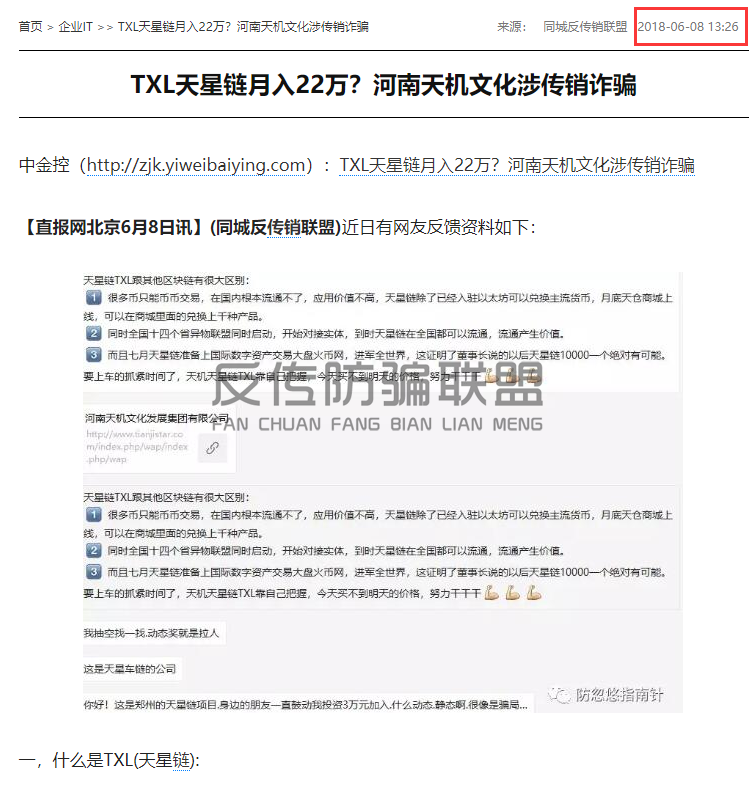 据网络报道,2018年,河南天机集团发布了一款名为“天星链TXL”的项目,以传销中拉人头的形式,以区块链、虚拟币等噱头忽悠老百姓投资参与,短短18天就圈钱8600万元。