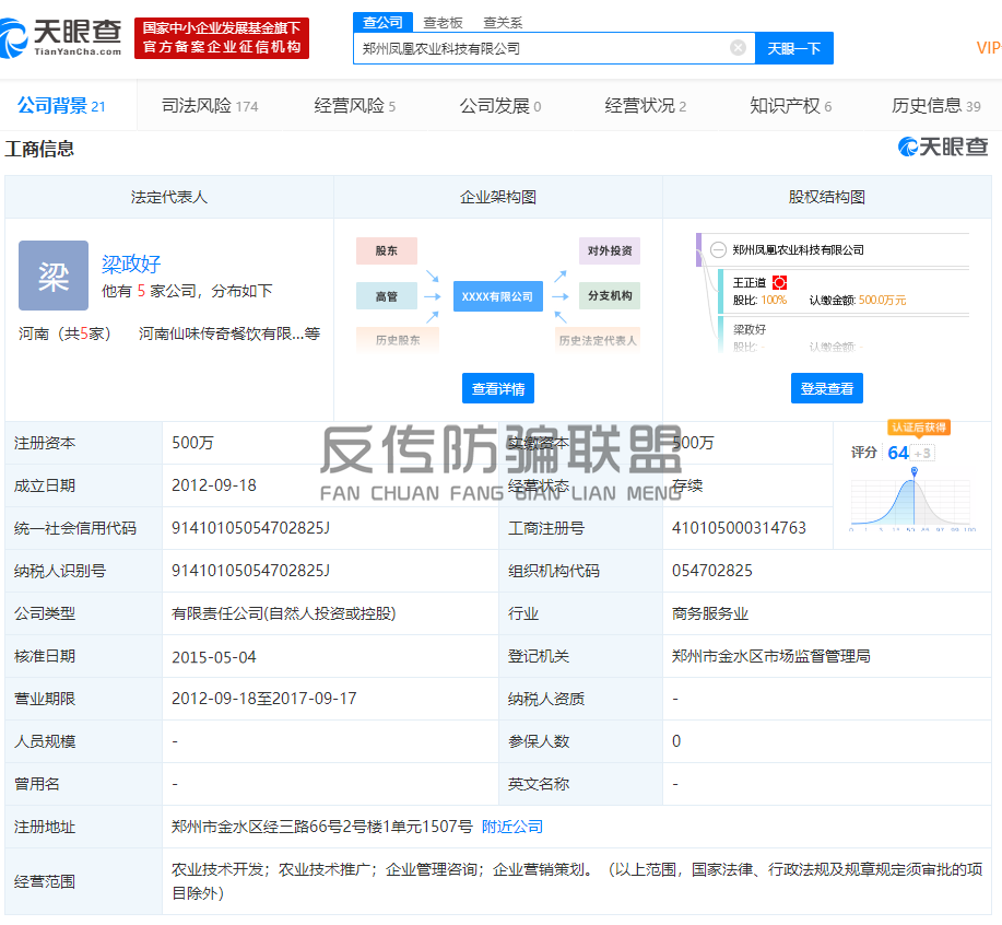 据天眼查显示,郑州凤凰农业科技有限公司成立于2012年9月18日,法人代表梁政好,注册资本500万,实缴资本500元,参保人数为0,可见该公司规模并不大。