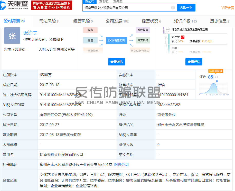 据天眼查显示,河南天机文化发展有限公司成立于2017年8月18日,注册资本6500万,实缴不详,法人代表张许宁。