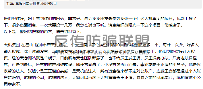 几日前,反传防骗联盟接到网民举报河南天机集团涉嫌传销集资诈骗,实际上天机集团涉传骗局的报道网络上两年前就已有过报道: