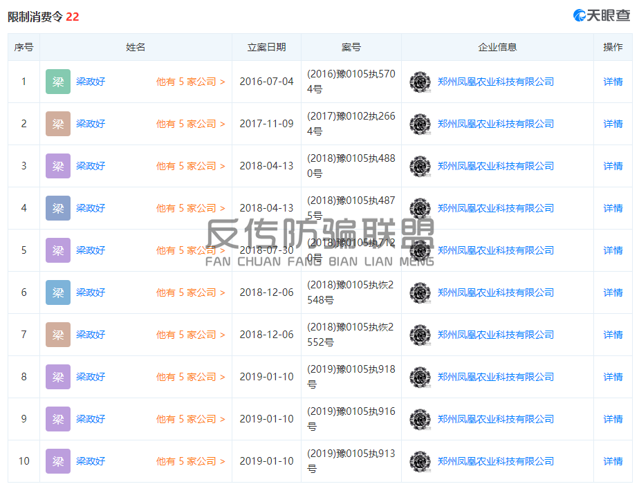 2016-2019年三年期间,凤凰实业法人代表梁政好“限制消费令”次数高达22次。