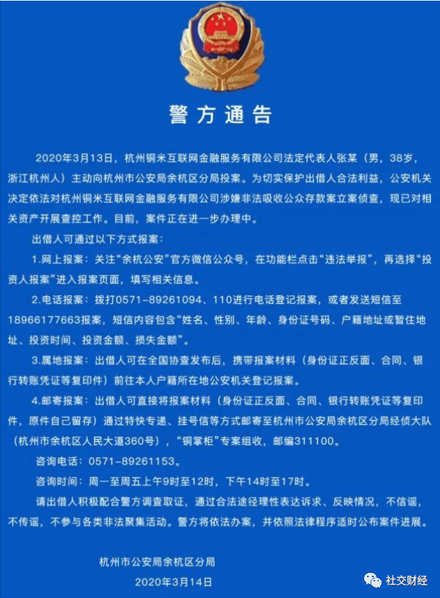 近日,余杭公安官方微博发布消息称,2020年3月13日,杭州铜米互联网金融服务有限公司法定代表人张某(男,38岁,浙江杭州人)主动向杭州市公安局余杭区分局投案。