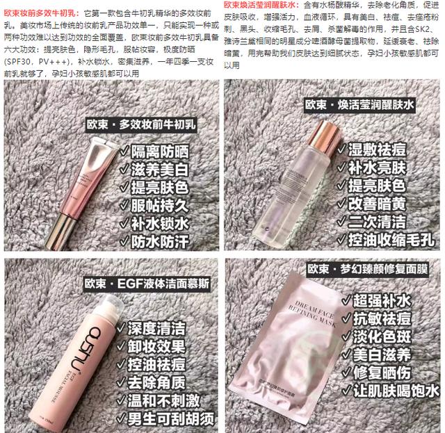 针对以上欧束产品的宣传,刘明称:这太假了!我查了一下上述产品的备案信息,所有的都是非特殊用途化妆品。但欧束多效妆前(牛初)乳却宣传具有防晒类化妆品具有的功效;欧束焕活莹润醒肤水宣传“促进血液循环,具有美白、杀菌解毒”等功效,不仅超范围宣传美白类化妆品的作用,而且使用医疗用语;“EGF”一词在2019年1月份被药监总局禁用于化妆品宣传,欧束洁面慕斯却依然使用;欧束梦幻臻颜修护面膜宣传“抗敏”、“淡化色斑、美白”等功效,同样不但超范围宣传美白祛斑类化妆品的作用,而且暗示医疗作用。这几款产品严重违反了《化妆品卫生监督条例》的相关规定。