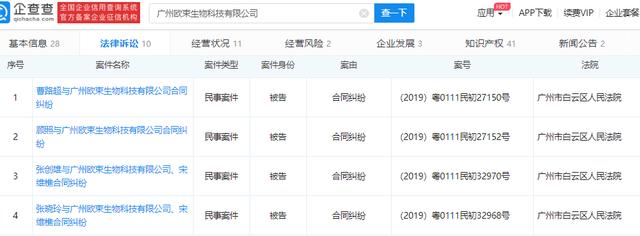 企查查显示:因合同纠纷,在2019年11月和12月份,有4人将欧束公司连带董事长宋维樵告上了法庭。