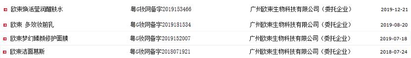 企查查显示,广州欧束化妆品有限公司(以下简称“欧束公司”)是3类日化用品商标“欧束”的拥有方,成立于2016年6月7日,注册资金3000万,无实缴资金记录。法定代表人为韩艺,但100%控股大股东、实际控制人和最终受益人都是宋维樵。2019年7月22日,法定代表人由宋维樵变更为韩艺。