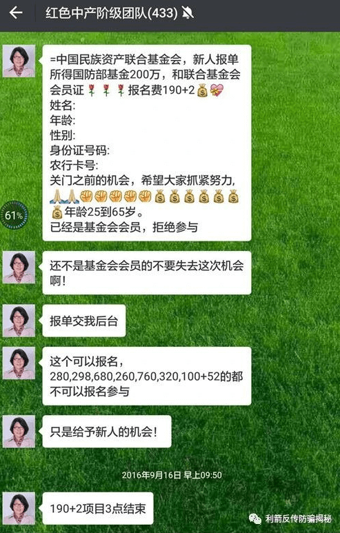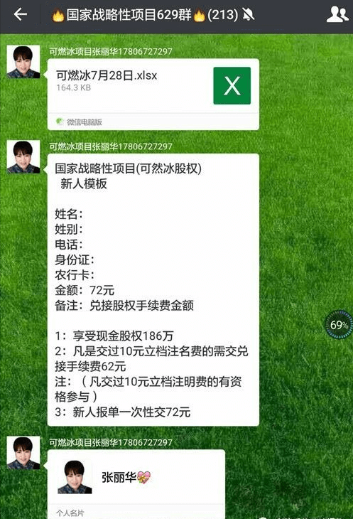 “总裁”到微信群,QQ群里面吹嘘,有个国家支持发展的农业绿色环保项目,刚刚才开始,他在网上找了有关各种部门大力发展农村经济的红头文件与视频,把这公司的营业执照,银行开户许可证发到微信,QQ群里面,并且宣传投资1000元1份,半年后每份回报2000元,有个人看见他投资了100份,是10万元,就赶快投资了1万元,这个投资1万元的人就到别的群里发资料,发制度,又一个人听了这个人的吹嘘,来投资了10份........