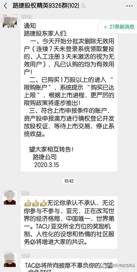 几天后“总裁”消失了,“董事长”只能发个通知:总裁因病辞职了!又过了段时间后,“董事长”在美国纳斯达克大屏幕上了,宣传公司要在美国上市,以后个个都是百万富翁,千万富婆,许多人看了,拼命交钱,一月,两月,三月...都是这么宣传,下面的团队长挣了不少推荐奖,“董事长”也变成了千万富豪。终于有一天,某些团队长发现“董事长”已经是美国籍了。没法,挣了大家的推荐奖,被人举报到警方要坐牢,没收违法所得,还要罚金,只好天天在群里说:快开网了,快上市了........静等花开.......