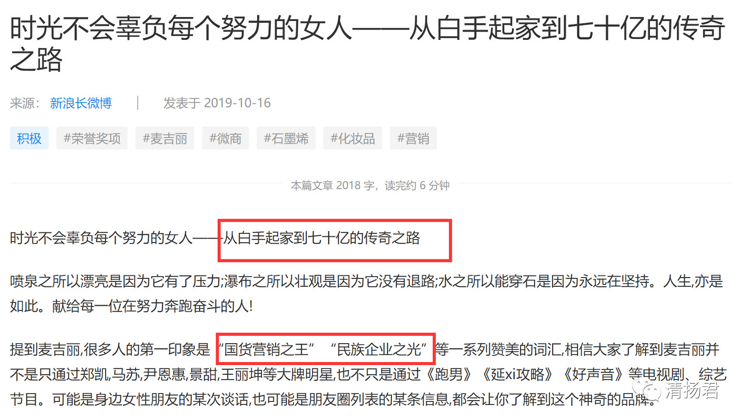 为什么说麦吉丽是微商红人呢,因为关于麦吉丽,至今网上还大量流传着“从白手起家到七十亿的传奇之路”的文章,以及“国货营销之王”、“民族企业之光”的赞誉。