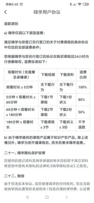 根据嗨学网用户协议,学员在交费后,观看课程时长≤5分钟,且无下载课程视频及资料行为的,可退100%的培训费;观看课程>5分钟,小于等于60分钟,下载1节课程及一份讲义的,退费比例为80%;观看时长超过180分钟的,则不予退款。