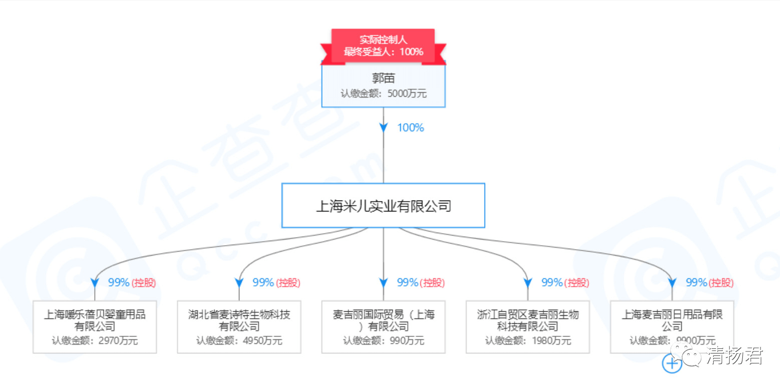 清扬君通过梳理发现,麦吉丽法定代表人、实际控制人郭苗持有麦吉丽99%股权的同时,还有掌控着一个“米儿实业”的日化帝国版图。
