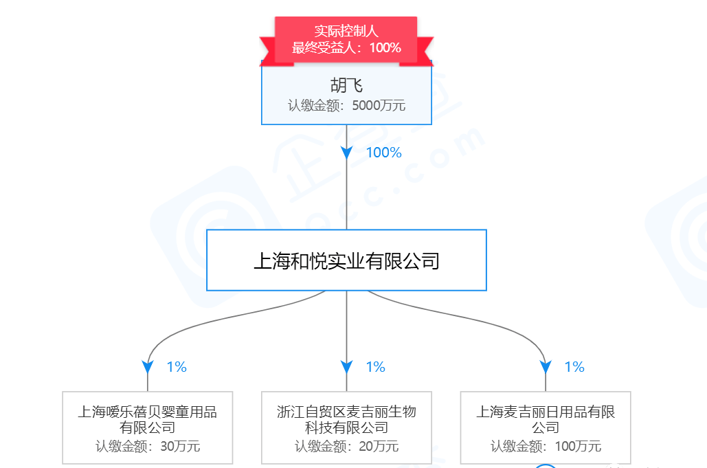 上海米儿实业有限公司1%股权的投资人是上海和悦实业有限公司。上海和悦实业有限公司是胡飞独资持有。上海和悦实业有限公司出资1%,参股了上海米儿实业有限公司控股的上海嗳乐蓓贝婴童用品有限公司、浙江自贸区麦吉丽生物科技有限公司和上海麦吉丽日用品有限公司三家公司。上海麦吉丽日用品有限公司又出资1%和上海米儿实业有限公司成立了麦吉丽国际贸易(上海)有限公司。据媒体公开报道,胡飞为麦吉丽品牌副总经理,多次公开参加麦吉丽重大活动。