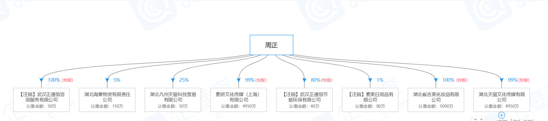 企查查显示:湖北吉美为周正独资持有,同时周正还持有99%股权的湖北天驱文化传媒有限公司、25%股权的湖北九州天驱科技贸易有限公司、5%股权的湖北海粟物资有限责任公司、独资持有武汉正通恒咨询服务有限公司(已注销)、80%股权的武汉正通恒节能环保有限公司(已注销)、1%股权的素美日用品有限公司(已注销)。