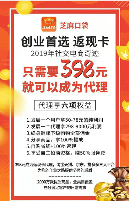 交纳398元发展一个用户拿50到78元,发展一个代理可以拿298到9000元自己购物百分百返现,还可以拿下级代理百分之五十服务费。