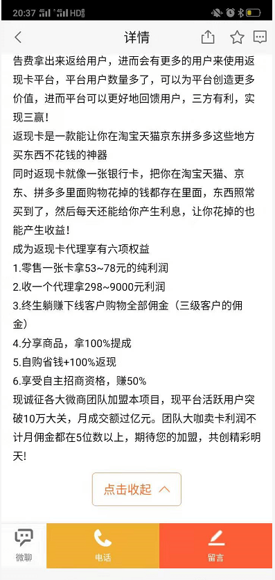 可以看出返现卡仅为该公司的行为,与电商平台无太大关联,招收代理宣传方面更是 有涉嫌传销的嫌疑