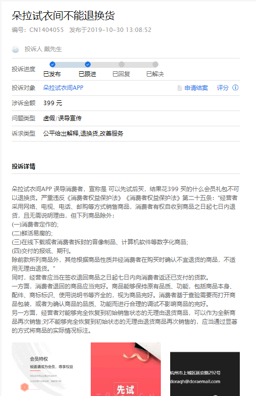 据黑猫投诉与聚投诉显示,诸多消费者反映“朵拉试衣间”不能退换货。据黑猫投诉平台某消费者投诉显示,宋女士花了5000元做了“朵拉试衣间”的店长,运作一段时间后,发现平台的供应链响应慢,服装质量不达标,去年8月初向平台客服要求退货款3127.24元与保证金500元。