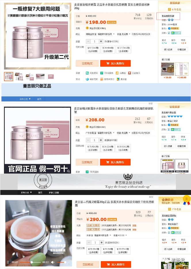 按当时照淘宝销量排名,第一名卖198元,第3名卖280元,第4名卖208元。该代理商原先是排在第二名,卖368元。按照公司的政策,这款眼霜指定零售价卖480元,VIP会员价7.5折,也就是卖360元。经过一段时间的销售后,代理商发现销量上不去,反而是那些卖198元的一直排在前面,而且号称是麦吉丽的批发中心、专卖中心。198元的销售价比代理商的进货价还低。