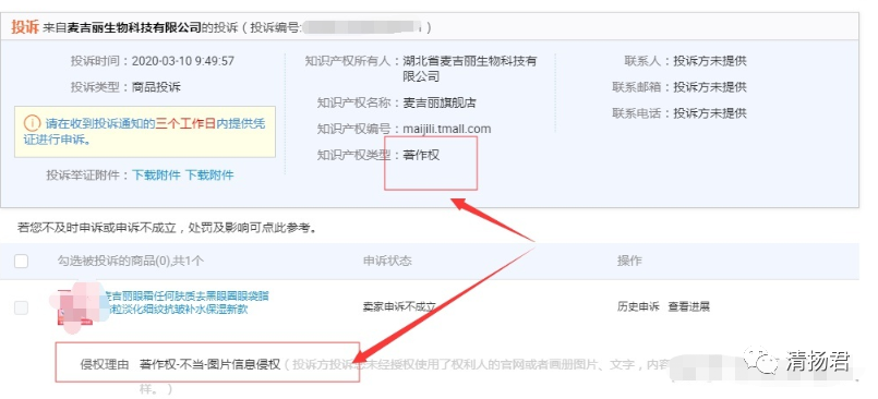 但结果出人意料,麦吉丽公司对违规销售的商家从2019年11月份到2020年3月份睁一只眼闭一只眼。相反该代理商3月6日反馈后,在4天后的3月10后就得到了“报复”,遭遇公司向淘宝投诉,投诉理由还是令人意想不到的“图片侵权”!而且期间没有电话通知、微信沟通。