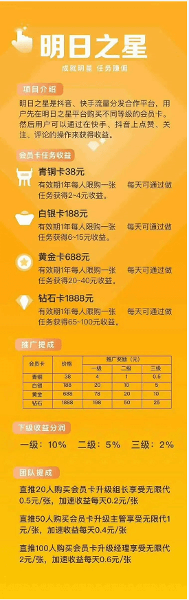 要获得收益,得先投入本钱。明日之星的收益不是白给,用户需要先购买会员,才能领取任务。根据记者得到的明日之星宣传页面,其会员卡任务收益分为四档,青铜卡38元,每天可通过做任务获得2~4元的收益,白银卡188元,每天可获得6~15元收益,黄金卡688元,每天可获得20~40元收益,钻石卡1888元,每天可获得65~100元收益,四个会员卡全部购买一天可以获得收益134元。这些套餐的有效期都是一年。