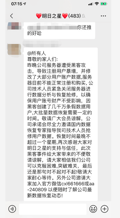 金女士看到,群主在群里@了所有人,称公司服务器遭受黑客攻击,目前不能正常注册和购买,公司技术人员紧急关闭服务器进行数据分析与恢复抢修。