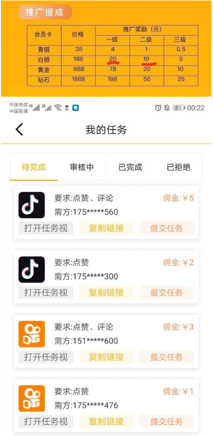 该平台的会员费比明日之星稍低,普通会员10元,VIP会员99元,高级VIP会员598元,同样分为任务收益和推广收益,以高级VIP会员为例,自己一天可做两条任务,一条20元,做任务的同时可以获得一级会员任务返佣10元/条,二级会员任务返佣5元/条,VIP等级低的会员拿不到等级比自己高的会员任务返佣,同级可拿。