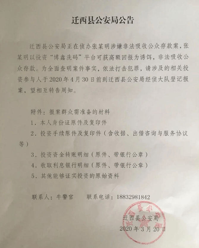 迁西县公安局正在侦办张某明涉嫌非法吸收公众存款案,张某明以投资“博鑫洗码“平台可获高额回报为诱饵,非法吸收公众存款。为全面查明案件事实,依法打击犯罪,请涉及的相关投资参与人于2020年4月30日前到迁西县公安局经侦大队登记报案,望相互转告周知。