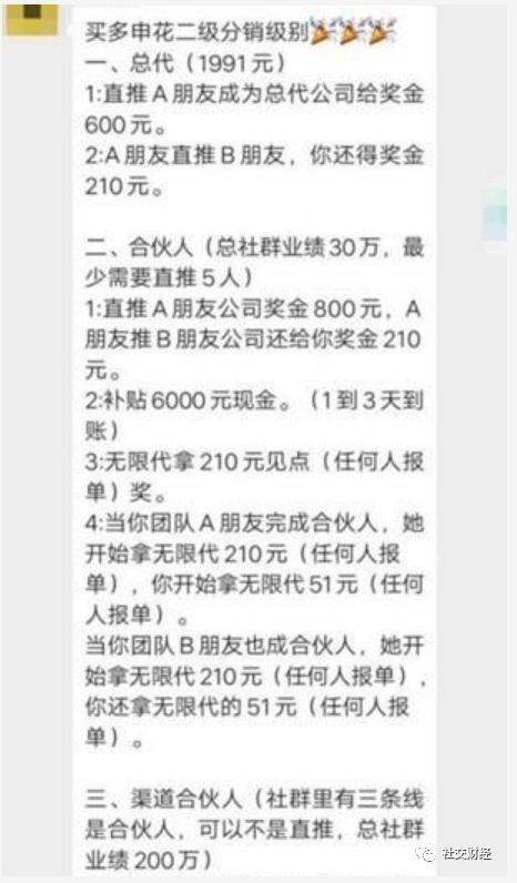 除了大肆在微信与朋友圈虚假宣传外,“申花太赫兹鞋”代理模式涉嫌传销,据了解,消费者花费1991元即可以拥有买多平台“总代理”资格。总代理可以帮助公司推广买多平台的总代理,赚取佣金。总代理直推一名总代理,自己可得600元佣金,间接推广一名总代理,自己可拿210元。此外,还有一个是“合伙人”资格。要获得该资格,合伙人需要直接推荐5位总代理,自己团队的总营业额达到30万元。合伙人的好处是,平台给合伙人6000块钱的创业补贴。同时,合伙人直推一位总代理,自己可获得800元佣金。自己的团队中只要有人报单,自己还能获得210元佣金。“不分层、不封顶。”
