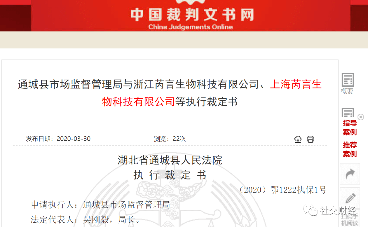近日,社交财经在中国裁判文书网发现一则题为《通城县市场监督管理局与浙江芮言生物科技有限公司、上海芮言生物科技有限公司等执行裁定书》,该裁定书是由湖北省通城县人民法院发布。