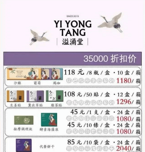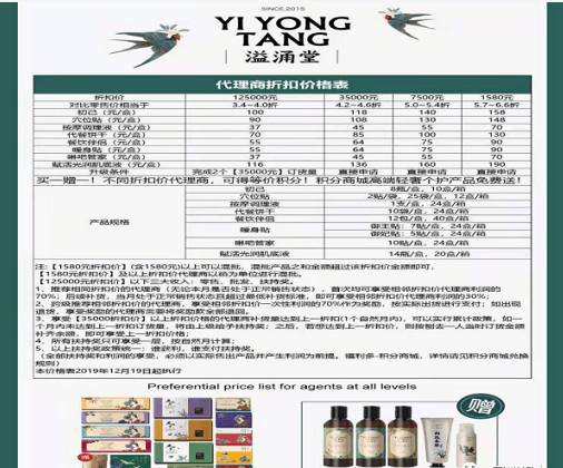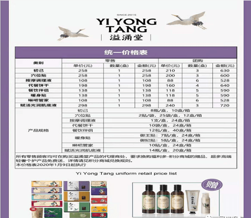 据悉溢涌堂老北京穴位贴的团购折扣价位258/盒,3盒优惠价600元,一盒50贴。要成为溢涌堂的代理,首先要严格遵循其定价体系,不允许打折降价行为。代理共有6个级别,分别为特约代理、二级代理、一级代理、总代理、执行董事和官方。不同的级别对应的产品价格不同,代理级别越高,拿货的单价便越低。对于初次加入的“新人”,一般推荐的是前三个较低级别的代理,分别是1580元、7500元、35000元。