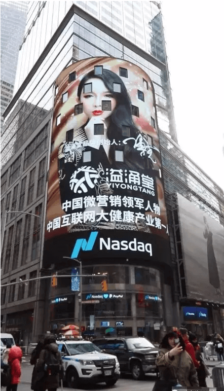 此外,溢涌堂在国内国外分别高调冠名了高铁列车以及登陆纽约时代广场纳斯达克大屏,以此“彰显企业的实力”。据公开资料显示,溢涌堂冠名的G725次列车于2018年7月10日,从大连北站首发开启。同年2月,纳斯达克高调亮相纽约时代广场的纳斯达克大屏。