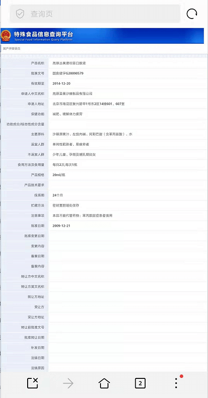 在一个包装盒下的居然是两款产品,而有小蓝帽的产品就是高原丛果牌呗菲口服液,而另外一款食品则是一款普通食品。小编通过查询得知减肥产品中添加了左旋肉碱。
