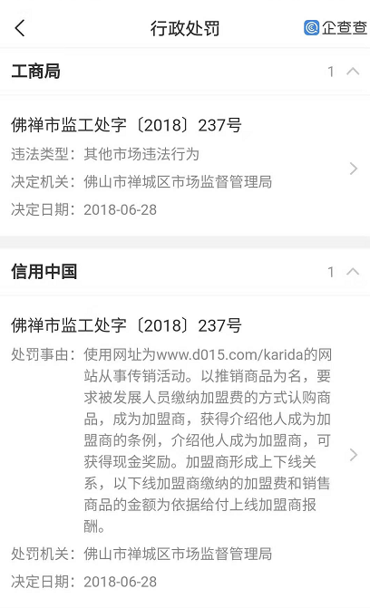 首先小编根据网友提供的信息通过企查查查询了一下公司,目前公司为广东卡维达商务集团有限公司。而在其行政处罚一栏,显示其因涉嫌传销被佛山工商部门处罚过
