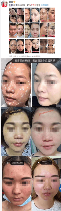 不过,通过有名有姓的“真实案例”组图对比,清扬君发现了一个奇怪的问题,消费者使用麦吉丽产品后可以祛斑、祛痘、解决激素脸,简直无所不能。