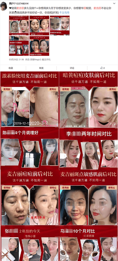 消费者使用效果图组图对比的方法,在很多年前不打广告的美容整形行业很常见,在化妆品行业中也有,但现在微商也大量使用,不知道是社会倒退了,还是消费者不愿意独立思考了。尤其是像麦吉丽投入这么多广告的情况下,还使用这么低级的P图营销手段,让人觉得是浪费广告费。清扬君隐隐为麦吉丽的增长担忧。不知道大家怎么看?