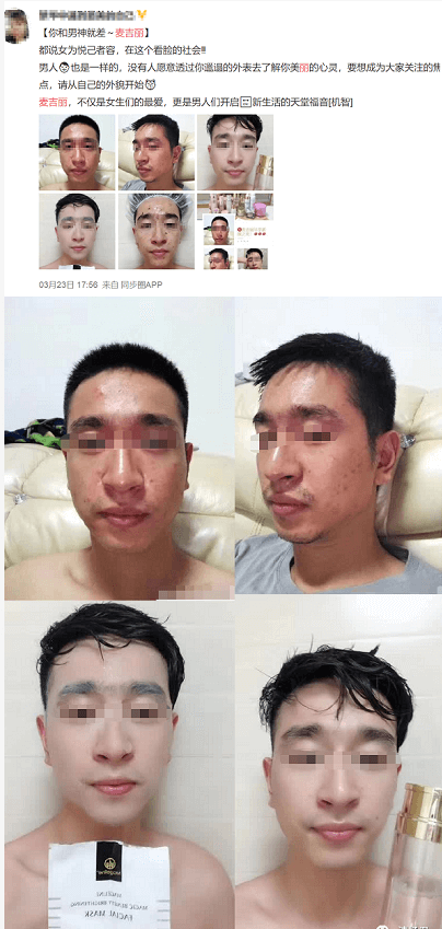 其配图是某男士使用麦吉丽产品前后的图片,同样,该消费者使用后不仅面部痘没了,脸白了,就连耳朵和上半身也变白了。如此这般,各位网友可以参照上面的分析自行对比。