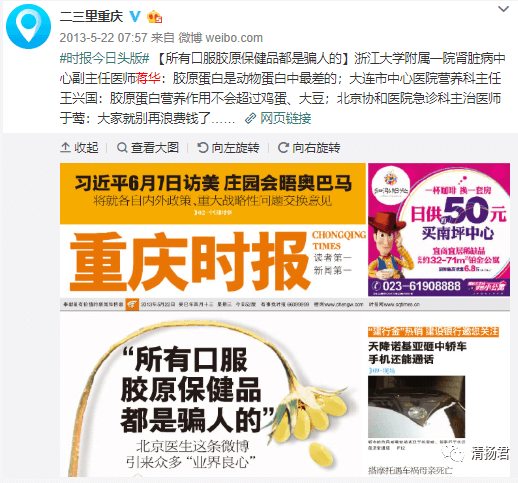 认证为“二三里资讯客户端重庆频道官方微博”也曾发表博文:【所有口服胶原保健品都是骗人的】浙江大学附属一院肾脏病中心副主任医师蒋华:胶原蛋白是动物蛋白中最差的;大连市中心医院营养科主任王兴国:胶原蛋白营养作用不会超过鸡蛋、大豆;北京协和医院急诊科主治医师于莺:大家就别再浪费钱了…
