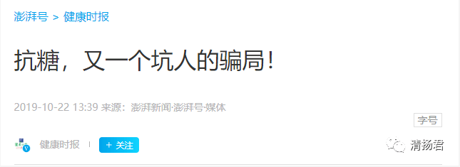 2019年10月22日,澎湃新闻《健康时报》发文《抗糖,又一个坑人的骗局!》。
