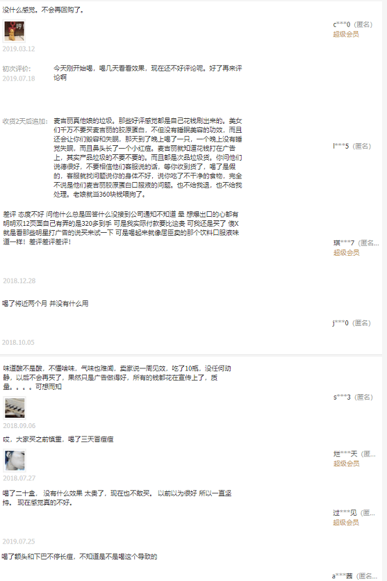 麦吉丽胶原蛋白果味饮品真的有如此强大而全面的功效吗?清扬君翻看了购买、食用该产品的一些网友评论,发现有多个网友对麦吉丽该款产品的功能并不认可: